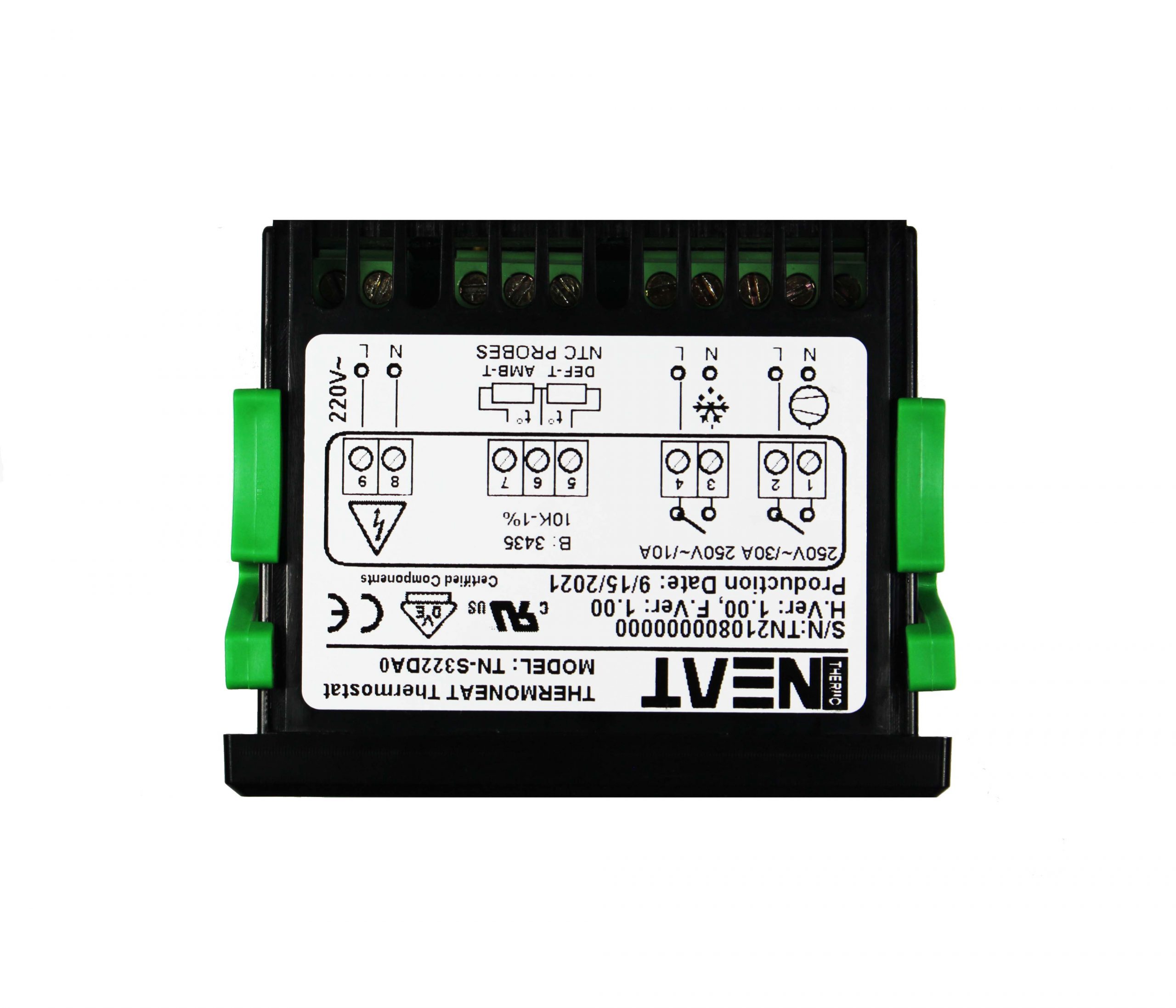 TN-S322DA0 digital thermostat is a microcontroller-based devices suitable for cooling or heating control applications. it utilizes two relays: One for driving a compressor or a heater (main relay) and the other one for defrosting. it uses two NTC-type sensors and is fully configurable through defined parameters in the setting menus which can be set via keypad.